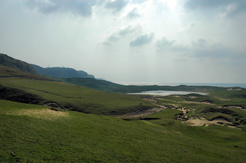 Machir Bay is just visible behind the dunes on the right. On the hills in the distance on the left you can just make out the telecommunications masts, on the same site where the WWII Radar installations once were. I don't know if the wee loch in the dunes has a name, if you know please leave it in the comments.