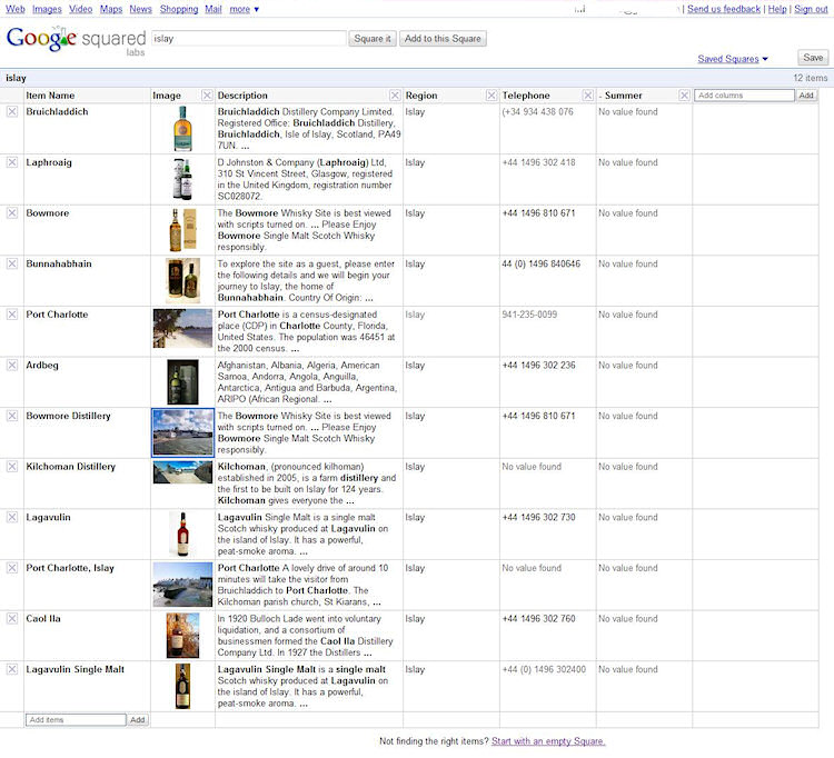 One of the latest tools available from Google is Google Squared. Inspired by an entry Funky search result on Google Squared I tried the new tool to see how it copes with a search for Islay. Not too surprisingly a plain search for Islay on Google Squared churns out a list of the whiskies and the distilleries on Islay: