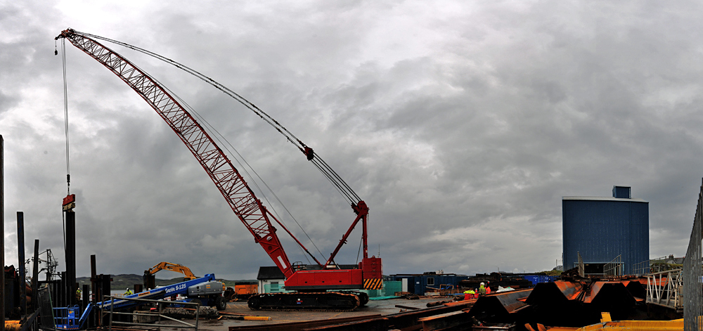 The old warehouse is now gone and the Calmac office is hiding behind piles of girders, containers, fences and other building materials. The huge crane (I believe the largest ever seen on Islay?) is dominating the scene. Here's an attempt of a quick panorama (sorry for the distortion):